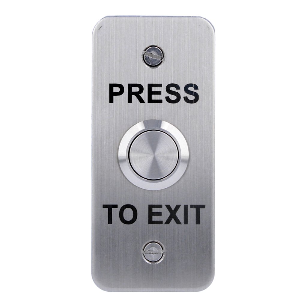 Pulsador de salida estrecho en acero inoxidable. Montaje en superficie